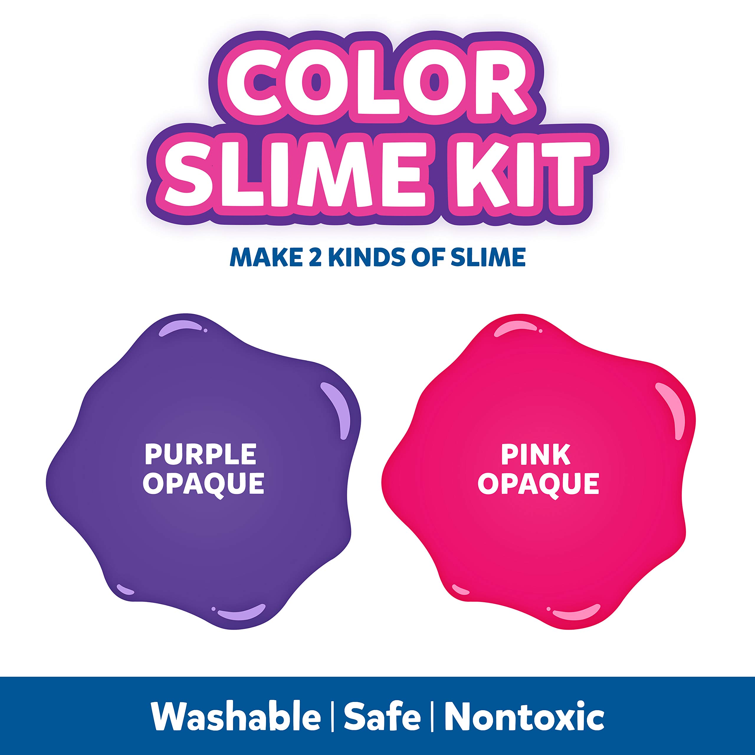 - Kit includes 1 bottle Pink Color Glue (5 oz.), 1 bottle Purple Color Glue (5 oz.), 2 bottles Magical Liquid (2.3 oz. each)